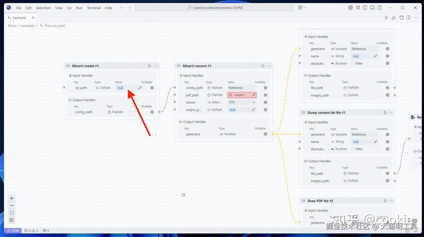 首先,来看这个流程图的第一个区块 MinerU model,这个区块负责加载 MinerU 的模型。我们要设置 dir_path 字段,设置一个文件夹来存储模型。