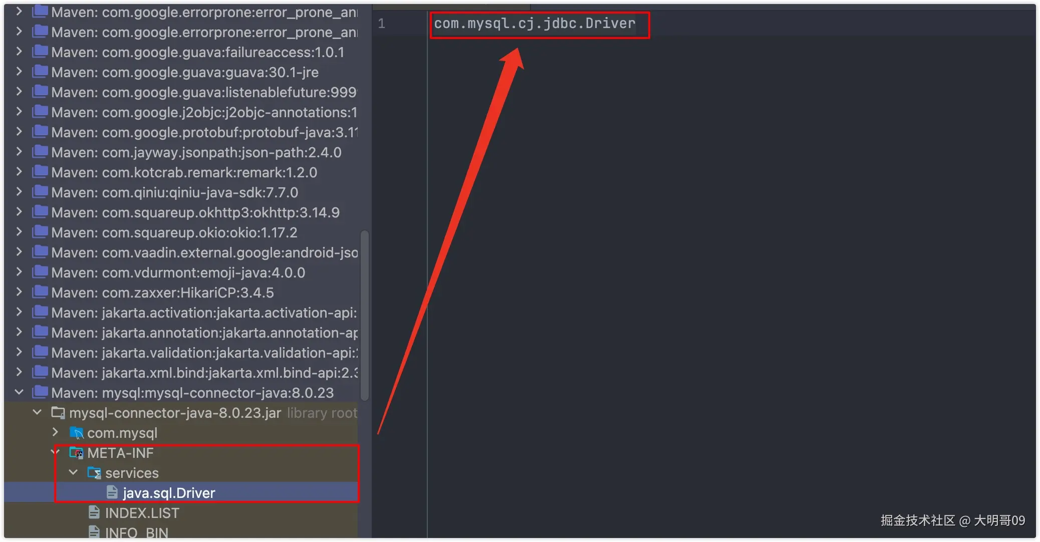 具体做法是,在 MySQL jar 包中的META-INF/services/java.sql.Driver 文件中会指明实现 Driver 接口的实现类是哪一个,例如: