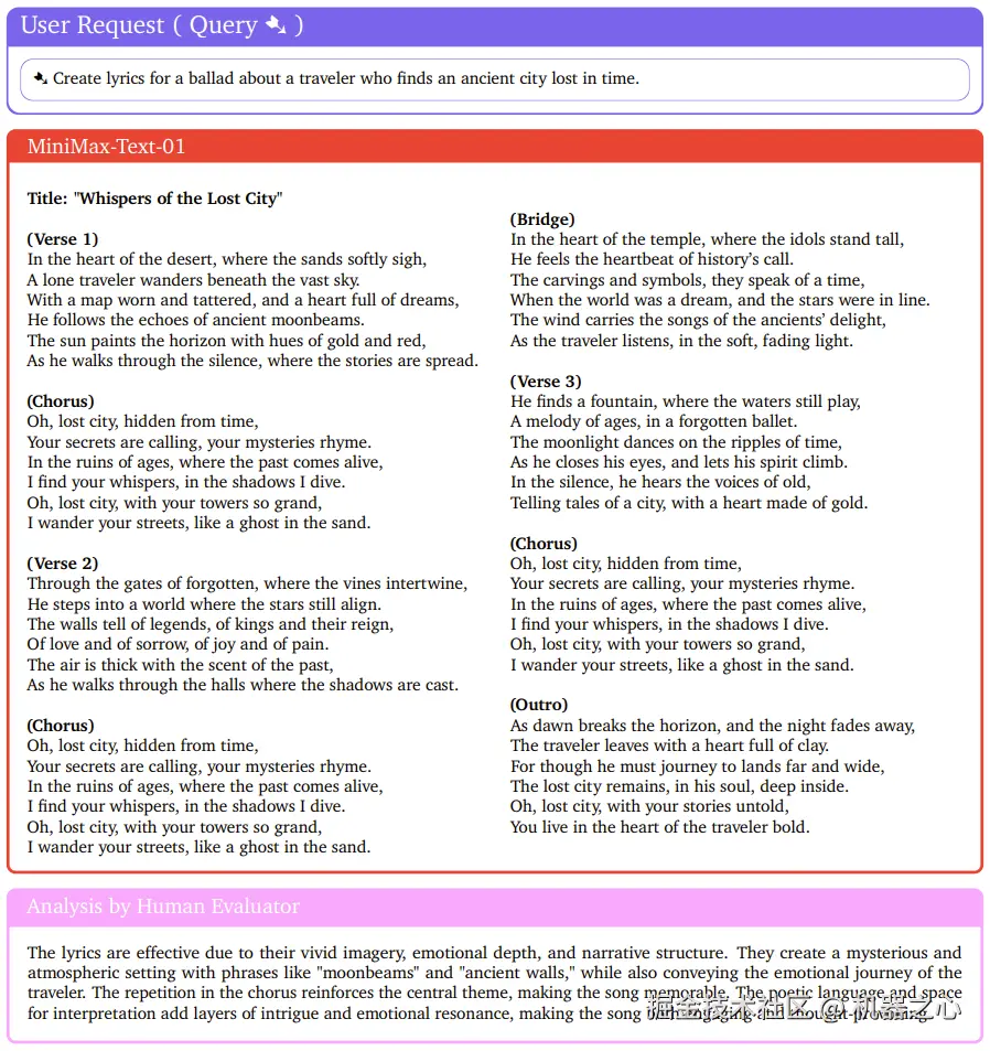 人类评估者也给出了非常正面的评价:诗意的语言和演绎空间为歌曲增添了层层的趣味和情感共鸣,使歌曲既引人入胜又发人深省。