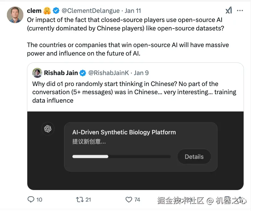 软件工程师 @ClaudiuDP 也表示:「可能是 AI 的训练数据中里,一些需要用来构建回答的信息是用中文写的。」