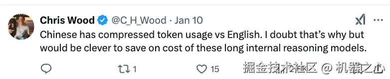 「与英语相比,中文压缩了 token 的使用。我怀疑这是否是原因,但节省这些冗长的内部推理模型的成本是明智之举。」
