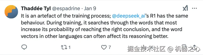 「这是训练过程中产生的一个现象。Deepseek 的 R1 模型也有同样的表现。在训练过程中,模型会搜索那些最能帮助它得出正确结论的词。而其他语言中的词向量往往能更好地影响它的推理过程。」