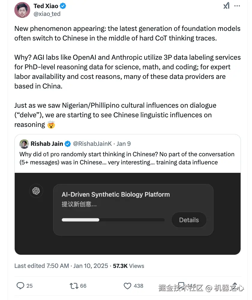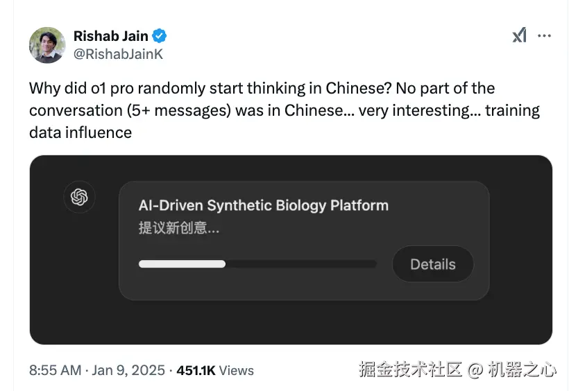 神经科学 × AI 研究员 Rishab Jain 也在 X 上表示疑惑:「为啥 o1 突然开始用中文思考了?明明整个对话(5 + 条消息)都是英文啊...... 很有意思...... 该不会是训练数据在作祟吧?」