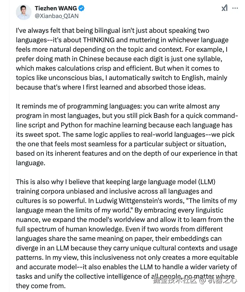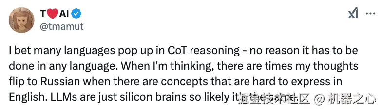 「作为一个中国人,我经常在脑子里用英文思考,因为我是双语者。所以我一点也不惊讶大语言模型会用中文思考,毕竟它们也是多语言通。只要最后输出的是预期语言就行,我觉得这不能算是幻觉。不过,这是不是要进一步思考:最好的 AI 思考方式,是不是应该是一种与具体语言无关的隐藏状态?」