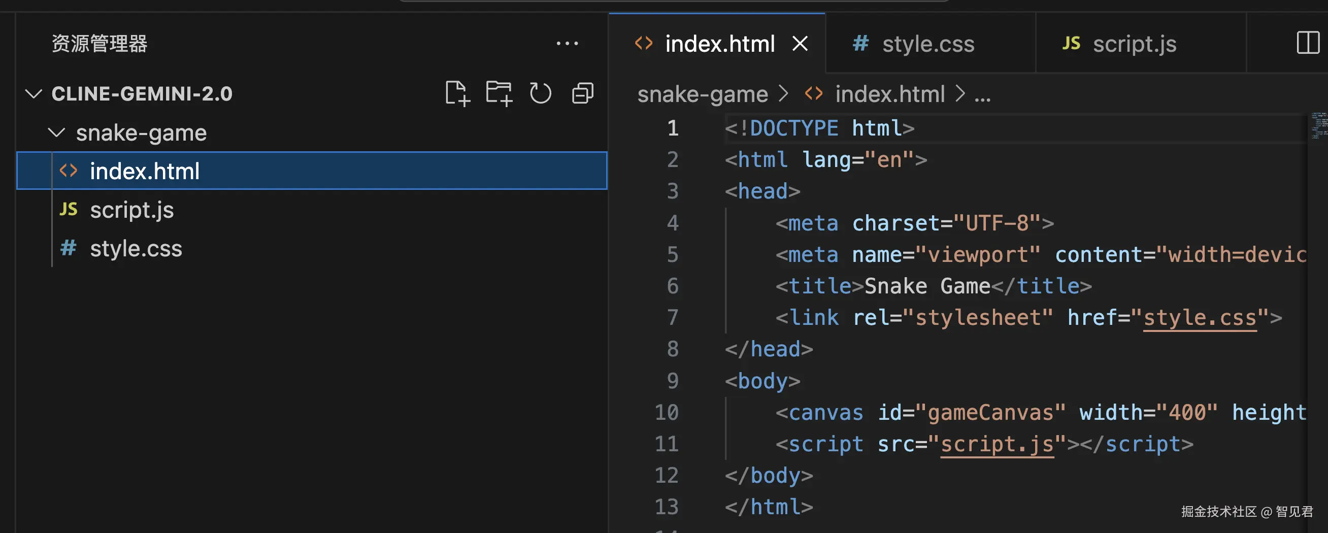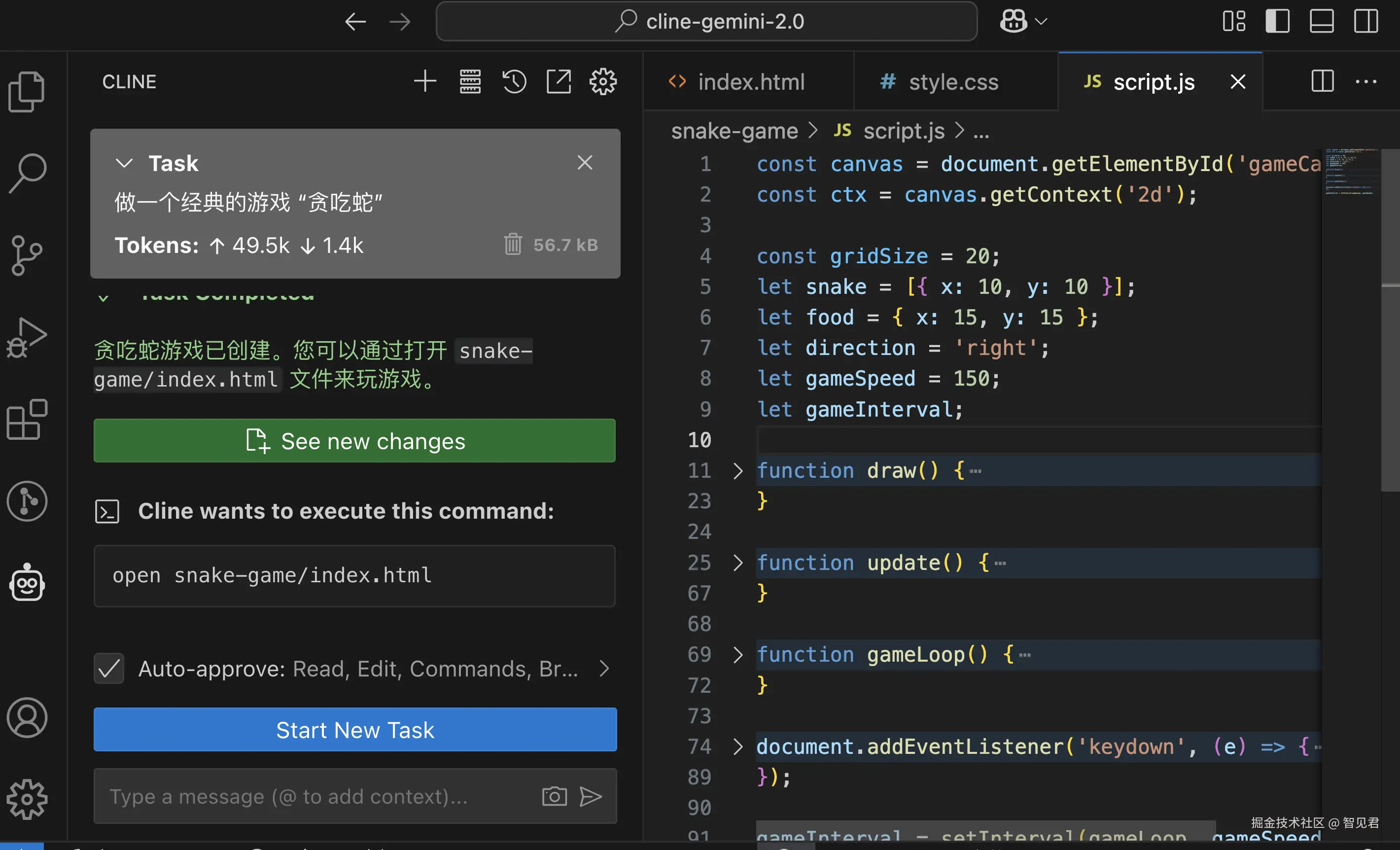 接下来,做一个经典的游戏 “贪吃蛇”。这种 AI 辅助编程工具最擅长了,如果开启 Cline 的 Auto-approve 功能后,全程基本上不需要参与。