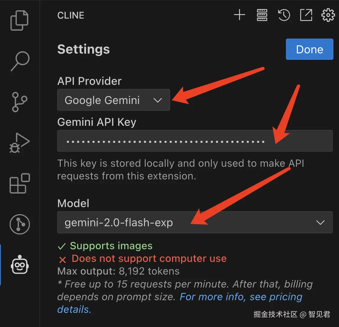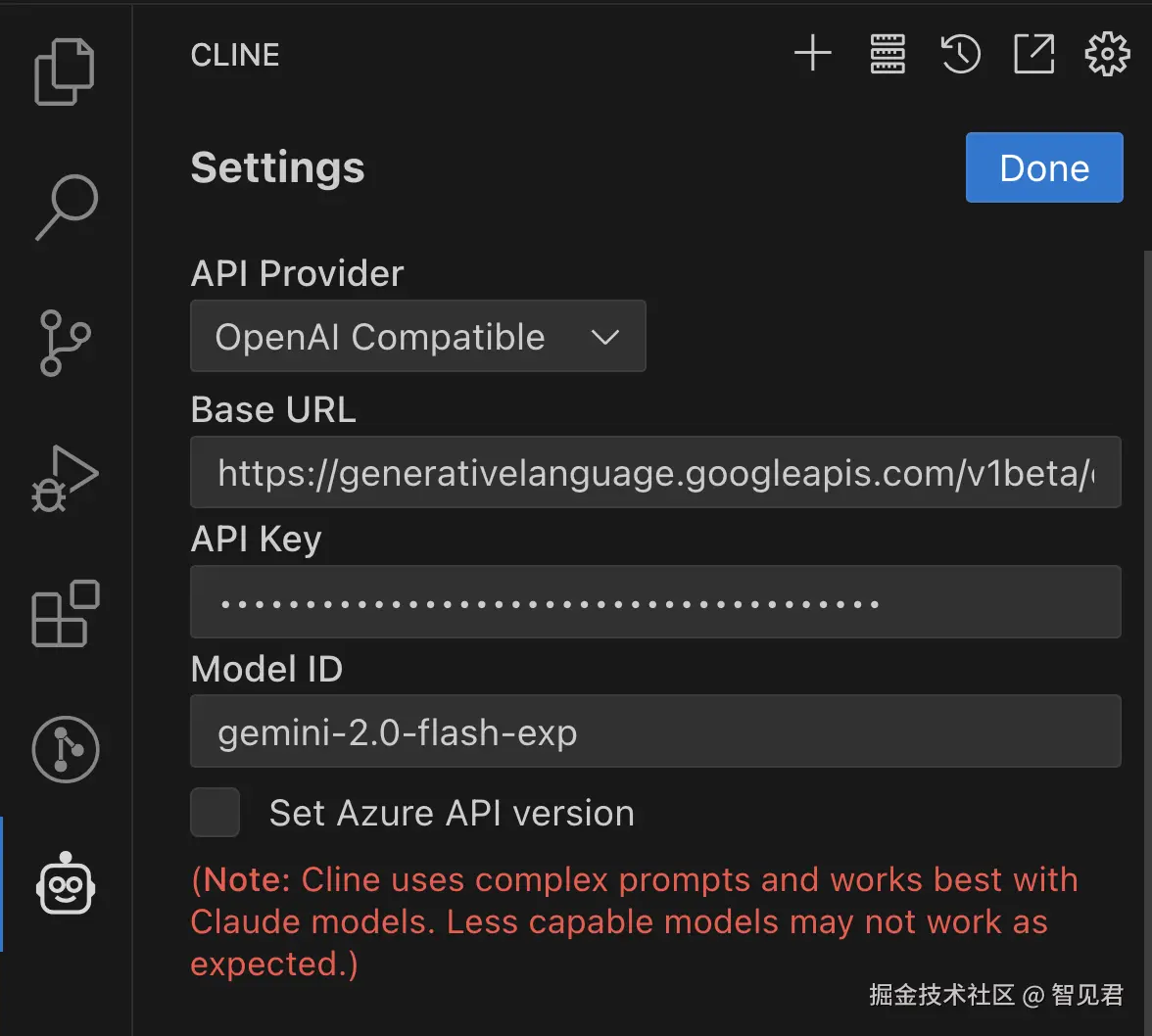 还有一种方法是 API Provider 直接选择 Gemini,如下配置。