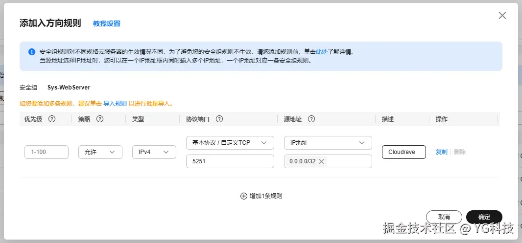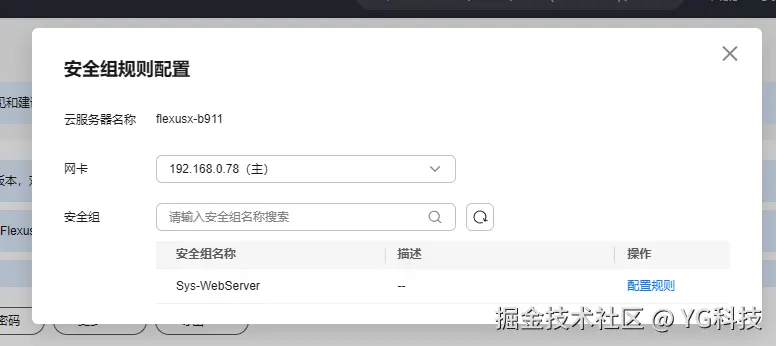 Cloudreve 默认会监听 5212 端口。所以需要打开这个端口,来到华为云控制台进行安全组规则配置,点击配置规则:
