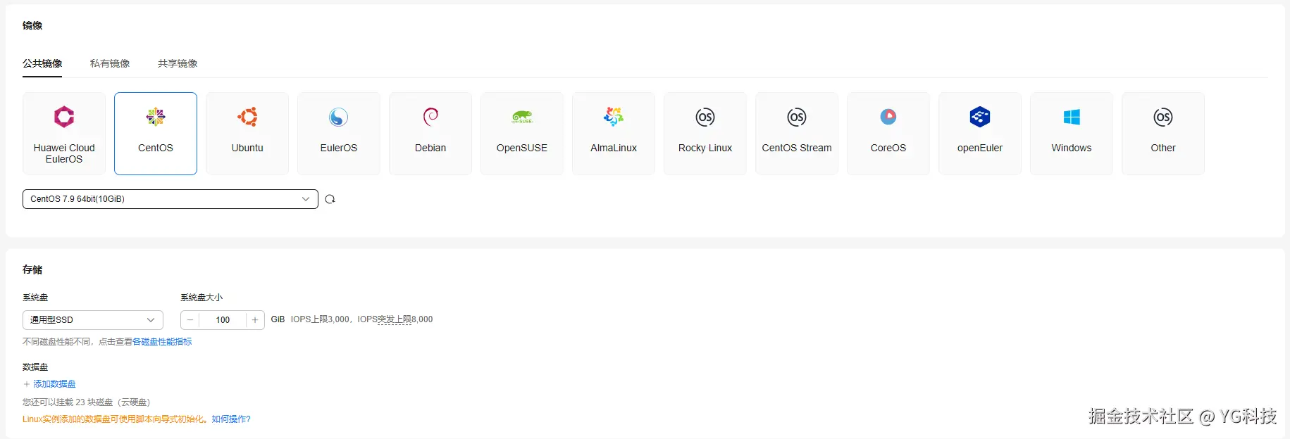 在配置页面中,我们精心选择计费模式、区域以及符合需求的实例规格,这里我选定了 4 核 12G 的配置。接着,在操作系统选择上,服务器常用的 CentOS7 系统成为首选,同时在存储系统盘的选择上,100GiB 通用 SSD 进入视野。不同类型的存储盘各有千秋,大家可参考详细的表格进行权衡。