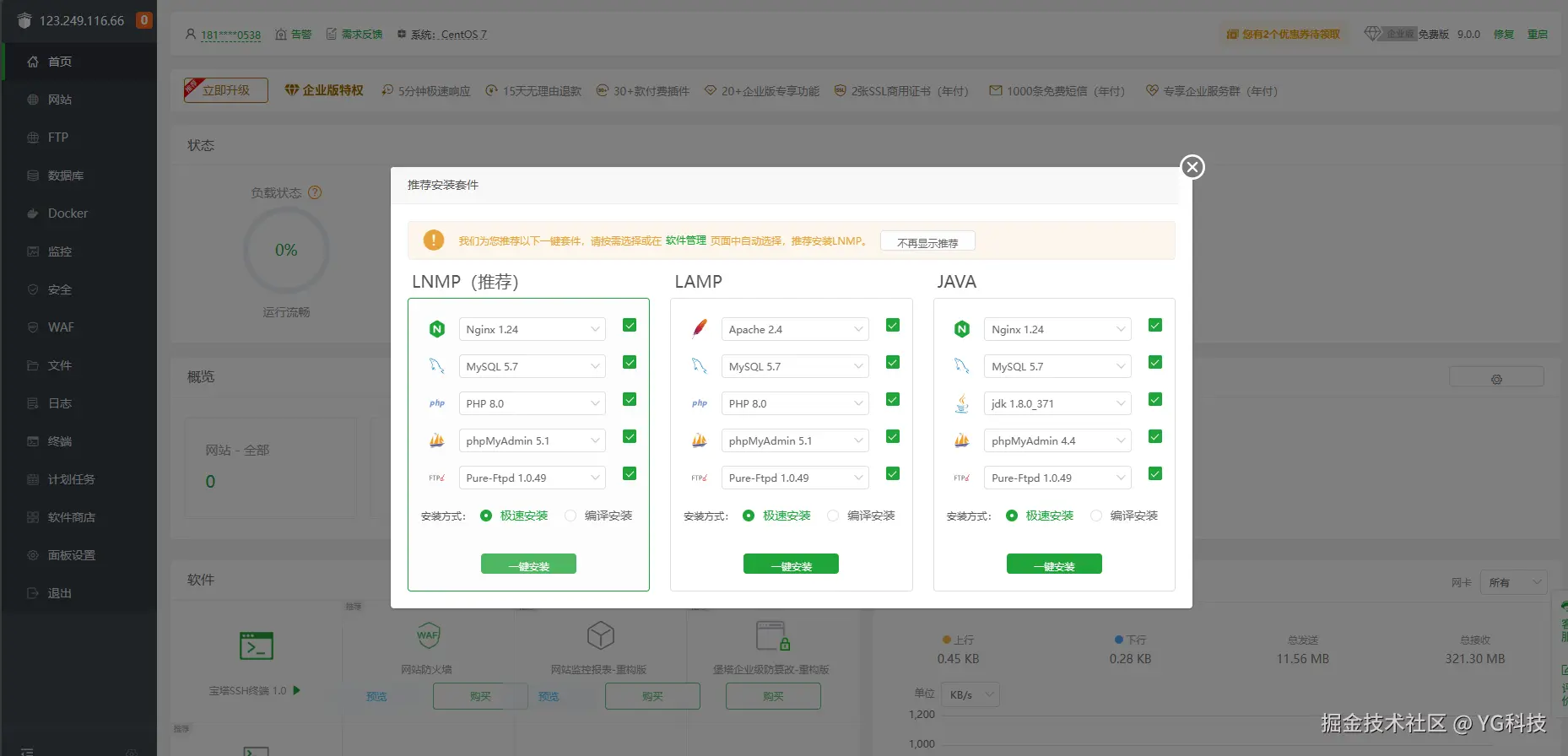 进入宝塔面板,安装推荐的 LNMP(Linux、Nginx、MySQL、PHP) 四件套。