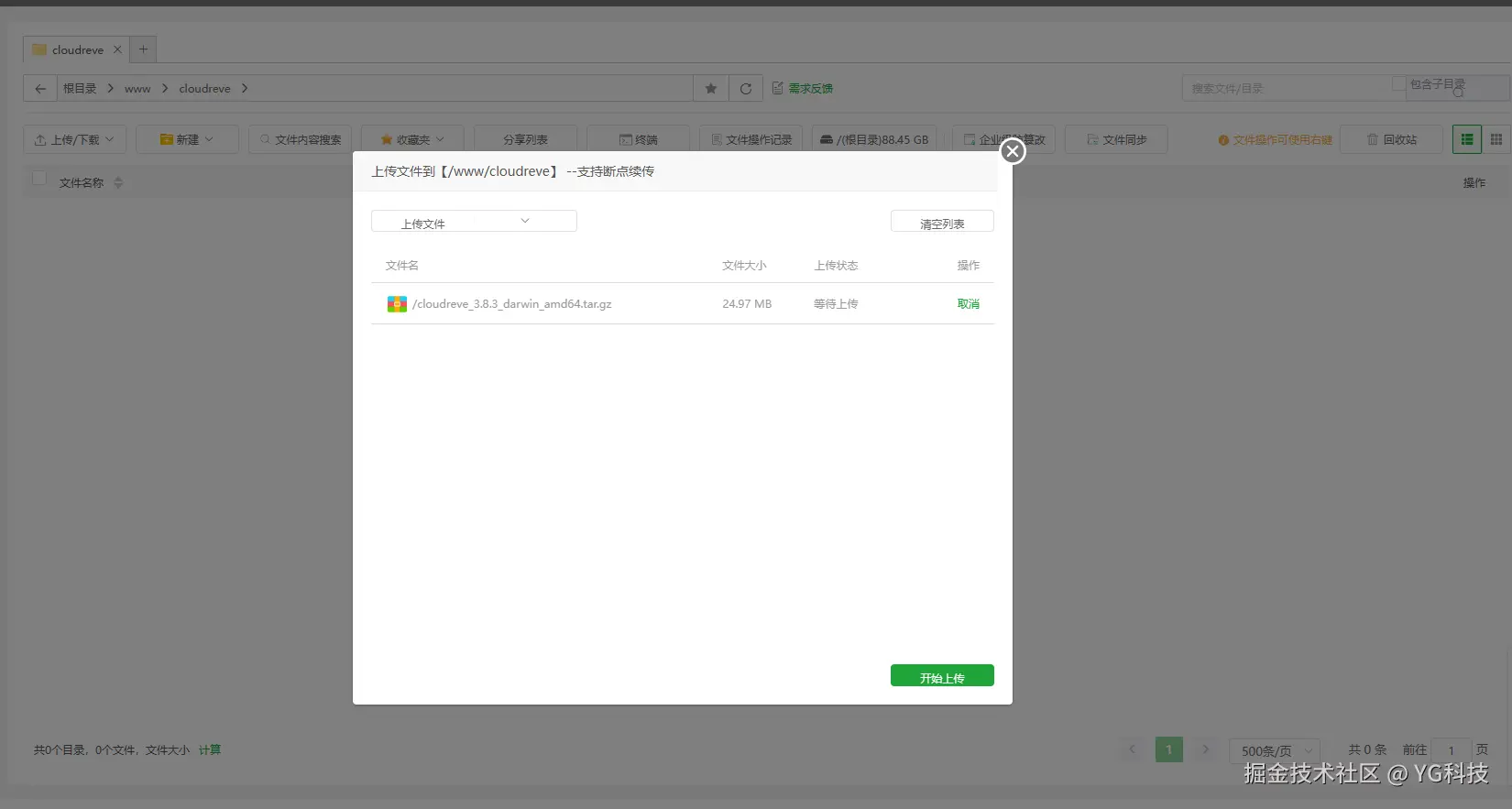 然后使用宝塔面板将 cloudreve 安装包传输到服务器上���