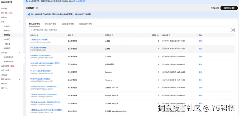 从模板导入:华为云提供了丰富的告警模板,涵盖常见的监控场景。用户可以根据选定的资源类型快速选择告警模板,节省时间。例如,系统预设的默认模板能够涵盖基础的 CPU、内存、磁盘等资源的告警规则,而自定义模板则可以更具针对性地监控特定业务场景下的关键指标。值得注意的是,对于一些特定资源类型(如事件监控),暂时不支持使用模板功能。