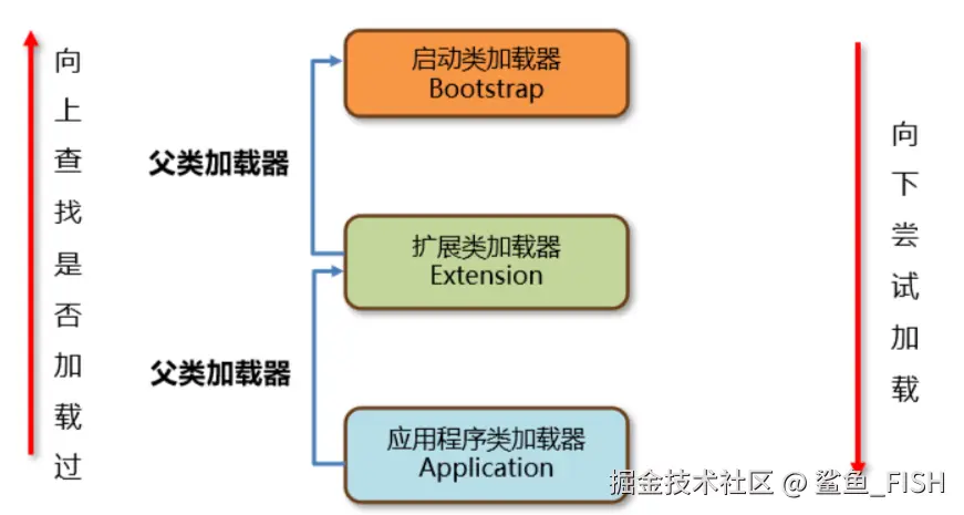 - 应用程序类加载器的父类加载器是扩展类加载器,扩展类加载器的父类加载器是启动类加载器。