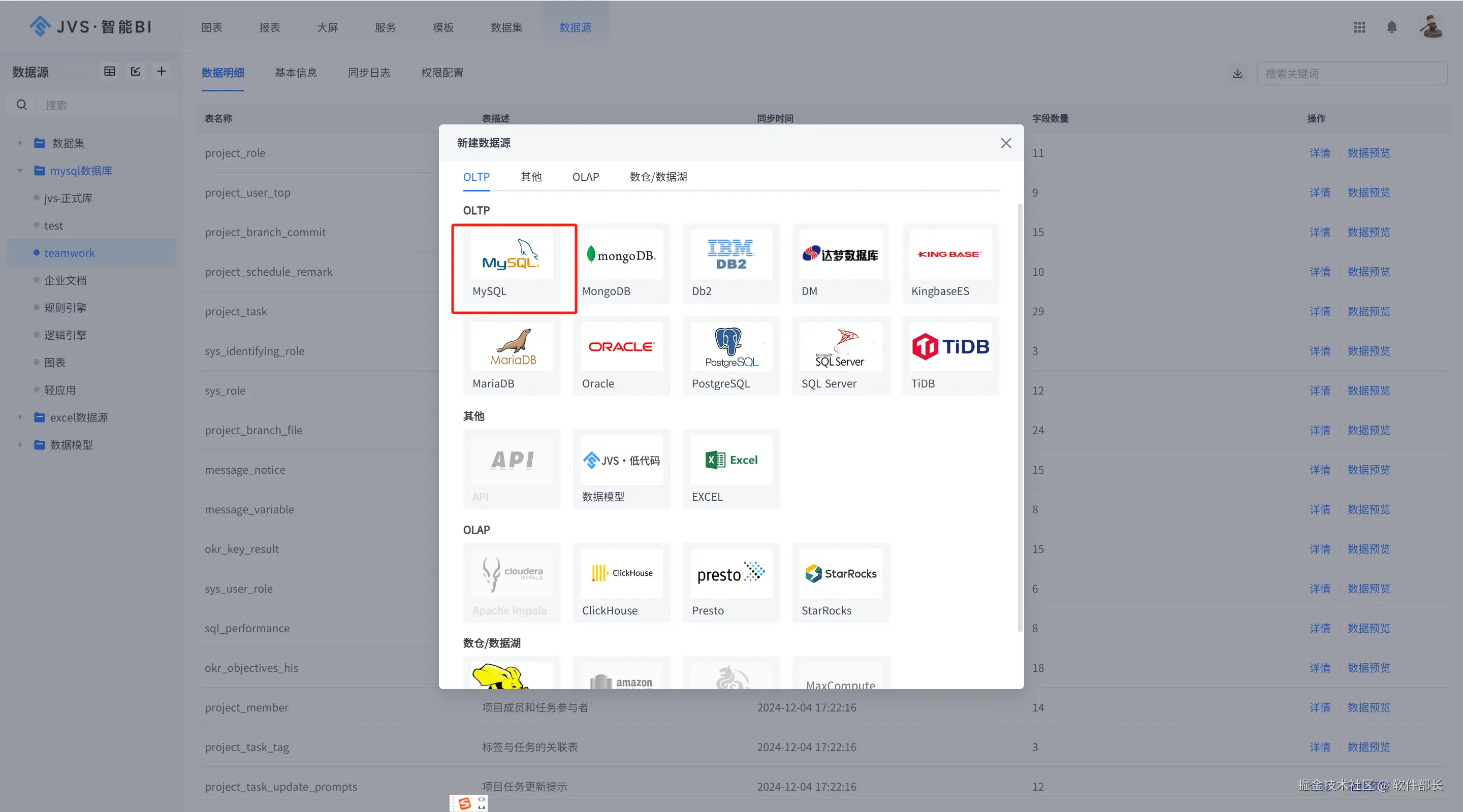 BI 系统是一种通过数据分析和信息管理工具,为企业提供决策支持的系统。其核心功能包括数据抽取整合、数据加工分析、数据决策支持。通过数据仓库、数据挖掘和在线分析处理(OLAP)技术,在这里我们先创建接入各个业务数据来源(数据库),如下图所示。