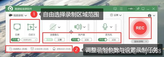 步骤2:自定义好录制区域范围,并调整录制参数以及可以设置好录制任务,点击 【REC】 即可进入录制。