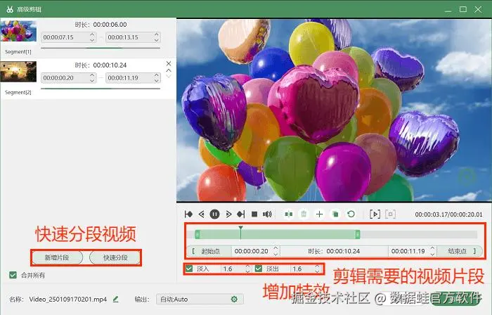 步骤3:录制完成后,我们就可以使用软件自带的后期编辑工具“高级剪辑”了。在“高级剪辑”中,我们可以快速分段视频、增加视频特效等。