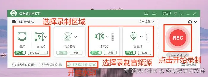 步骤2:在软件中选择录制的区域和音频源后,还可以按照需求开启水印录制。全部设置好了之后,点击“REC”按钮就可以开始录制视频了。