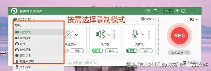 步骤1:录屏在哪里设置?首先点击打开电脑上的数据 蛙录屏软件,然后去录制模式选项中选择你需要的录制模式。本文以“视频录制”为例。