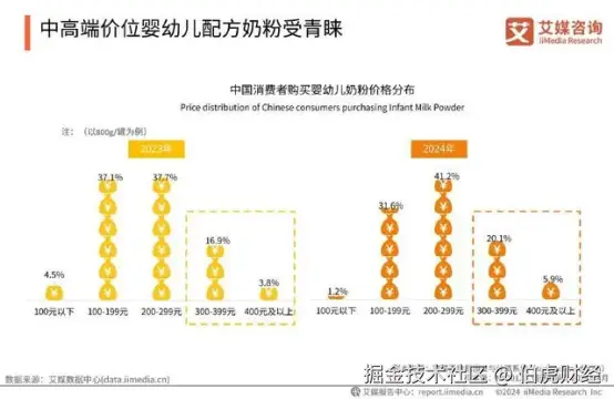 其次是消费者愿意为更高品质的婴配粉支付溢价。据统计,对比2023年,2024年消费者对婴幼儿奶粉的价格接受度有所提升,200元/罐及以上的占比均高于2023年。