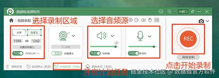 该软件支持不限时长的录制,且录制的视频默认无水印。如果你需要,还可以根据自己的需求添加图片或文字水印,增加视频的个性化元素。此外,还提供了计划录制、自动停止等高级功能,让你能够定时开始和结束录制,解放双手。录制完成后,你还可以使用软件自带的后期处理功能,对视频进行压缩、合并等操作,方便分享到不同平台。相比Xbox Game Bar,数据 蛙录屏软件在功能和自定义选项上更为丰富,尤其适合对画质和录制效果有较高要求的用户。操作步骤如下: