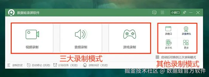 接下来,我们要隆重介绍的是数据 蛙录屏软件。这款软件以其专业级的功能和友好的界面,成为了众多专业录制者的首选,是录制电脑屏幕的软件中的佼佼者。这款电脑录屏工具不仅支持高清、声画同步的视频录制,还内置了多种录制模式,包括游戏录制、视频录制、音频录制、摄像头录制等,满足不同场景下的录制需求。