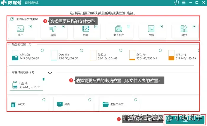 步骤1: 打开这款软件,在首页中选好需要恢复的文件类型和文件丢失需要扫描的位置,最后点击右下角按钮,开始扫描;
