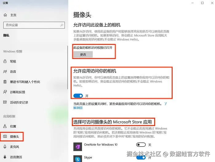 步骤2:别忘了,还要确保你想要使用的应用程序在下方的列表中被设定为允许访问摄像头哦。