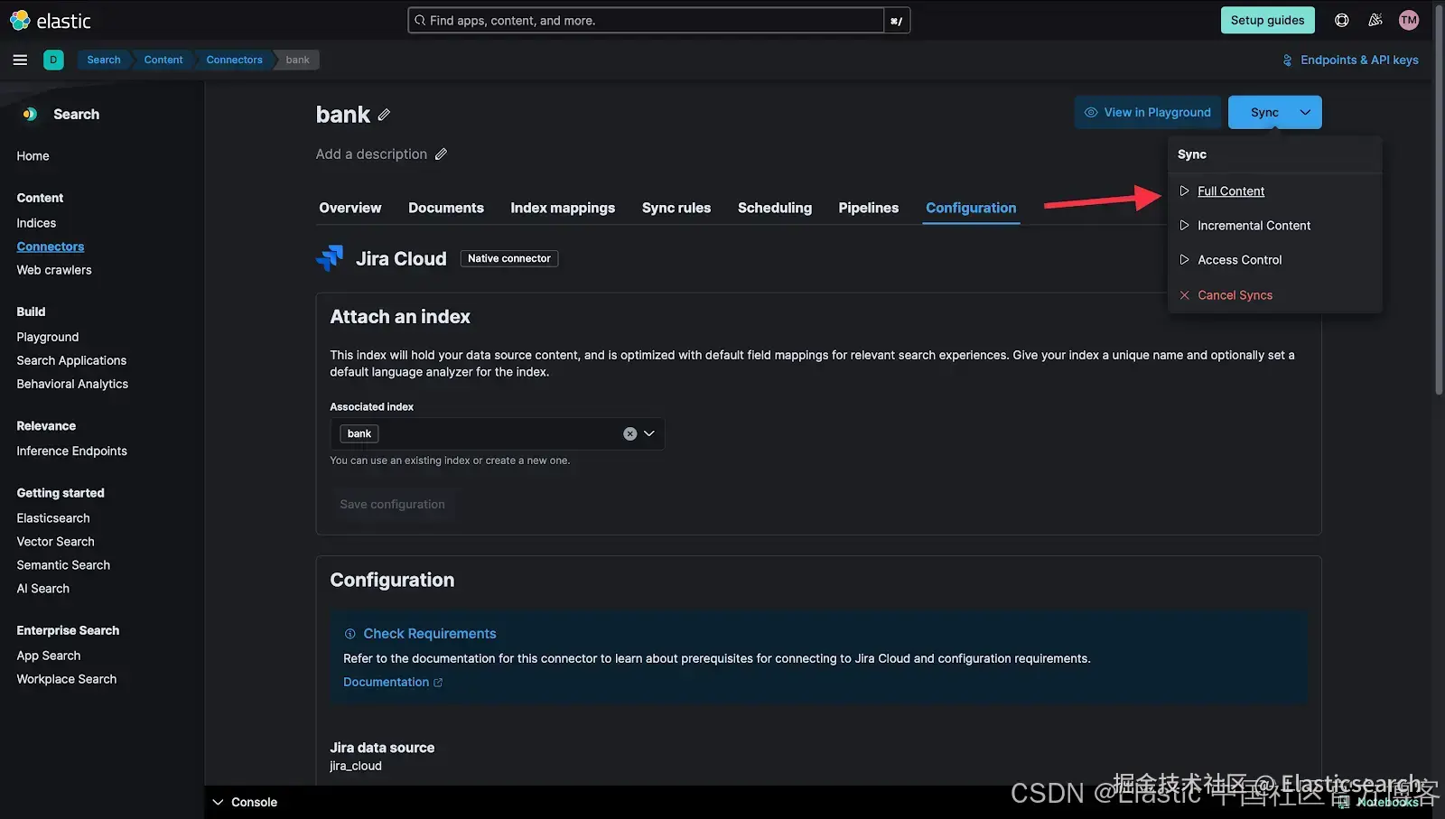 将连接器命名为 “bank”,然后点击 “Create and attach an index named bank”,即可创建一个同名的新索引。