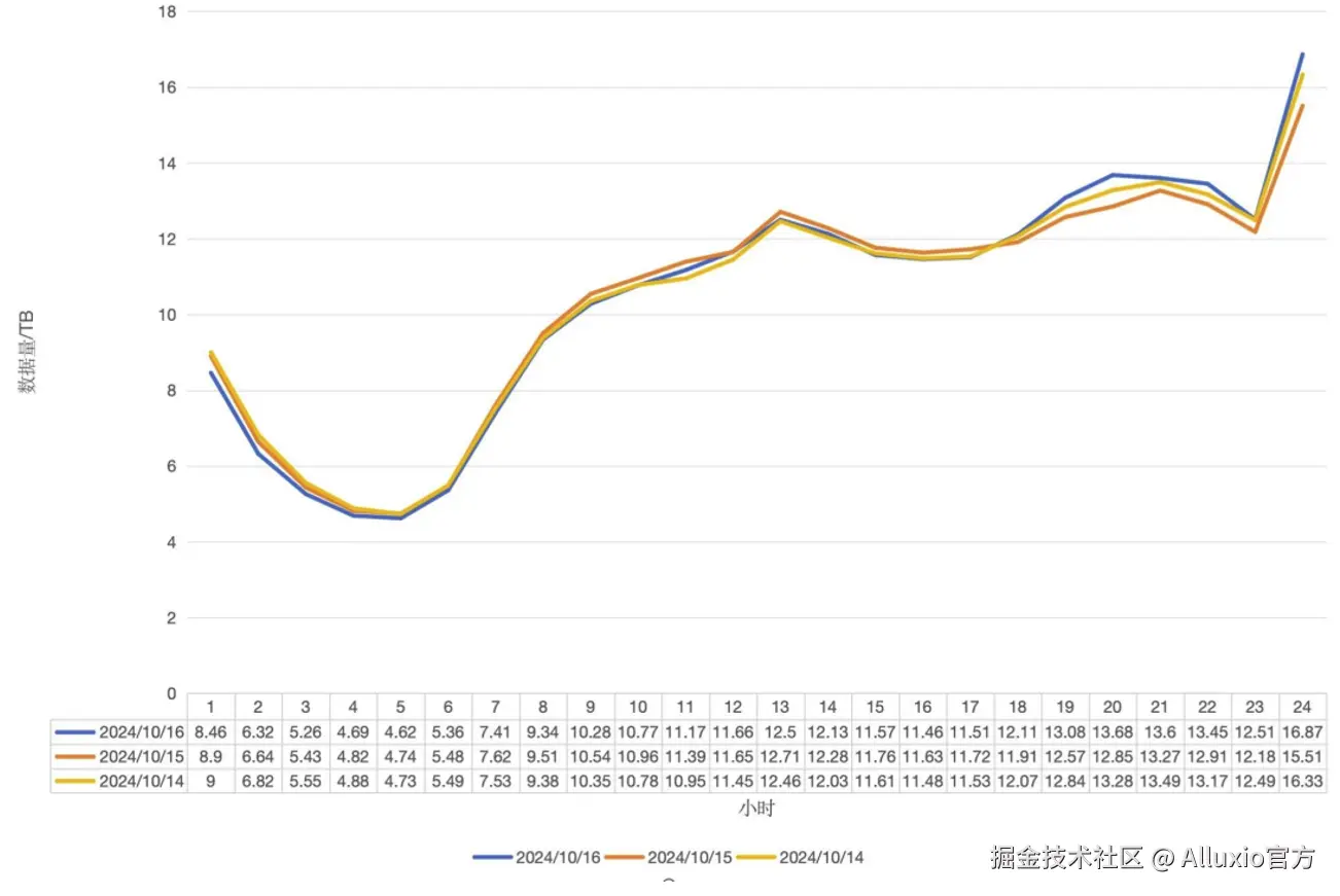 - 每小时的数据呈规律性波动,日传输数据总量达 310TB,平均每小时约 13TB(波峰 16TB,波谷 4.6TB)。