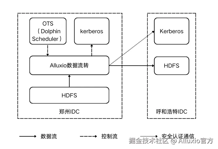 - O 域统一底座每小时生产数据,存储于 HDFS 集群,需要在一小时内传输至安全基座的 HDFS 集群,供业务加工,两套大数据平台都有自己独立的 KDC;