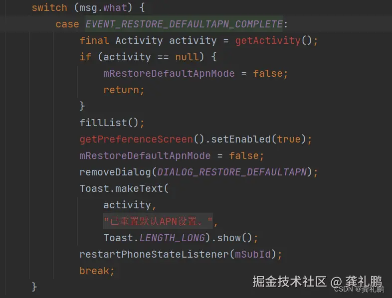 此处是重置过后的一些界面及状态的操作,其中fillList()中是调用了再次查询设置首选项apn的操作,然后进行界面刷新