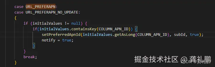 然后会走到TelephonyProvider类中检查values中是否包含apn_id,如果包含apn_id,获取apn_id带过来的id值,将对应的apn_id保存为该subId的首选APN,如下: