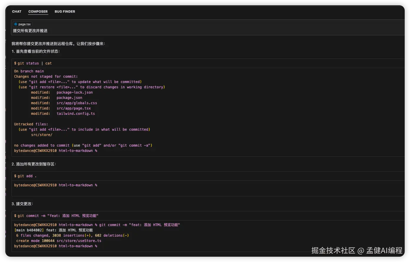 使用Agent,我们直接不用操纵Git,让它帮忙快速写好commit message并且提交: