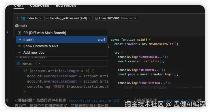 和Copilot类似,Cursor提供了更为强大的Chat能力,具体体现在以下6个方面: