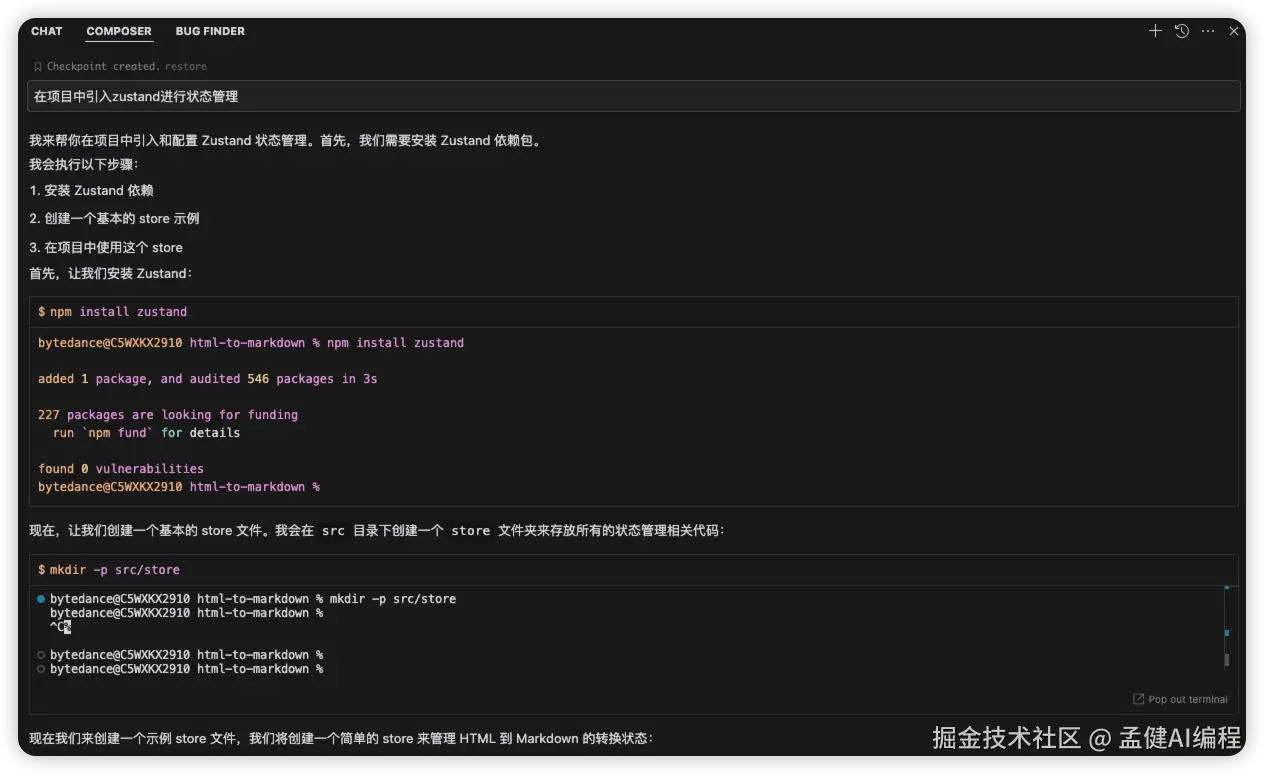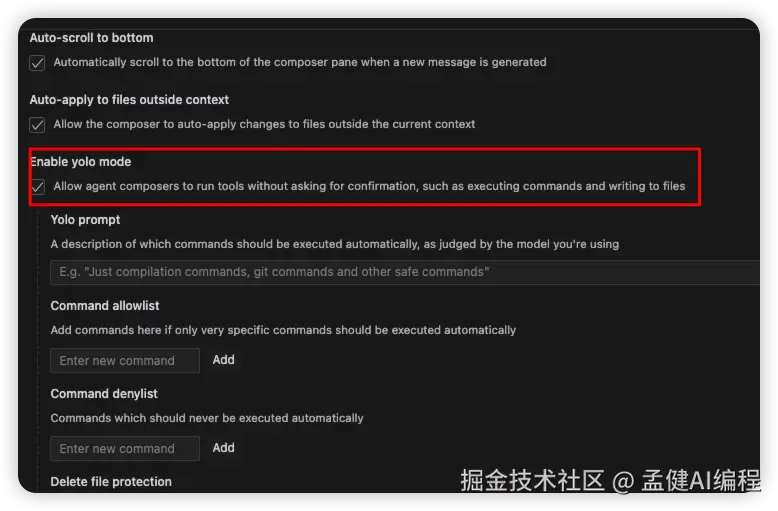 在composer的Agent模式下,我们可以给Agent一些简单的指令,它会自动拆解任务,执行终端命令,我们还可以借助YOLO模式的开启(Cursor Settings打开开关即可)来让终端命令自动执行: