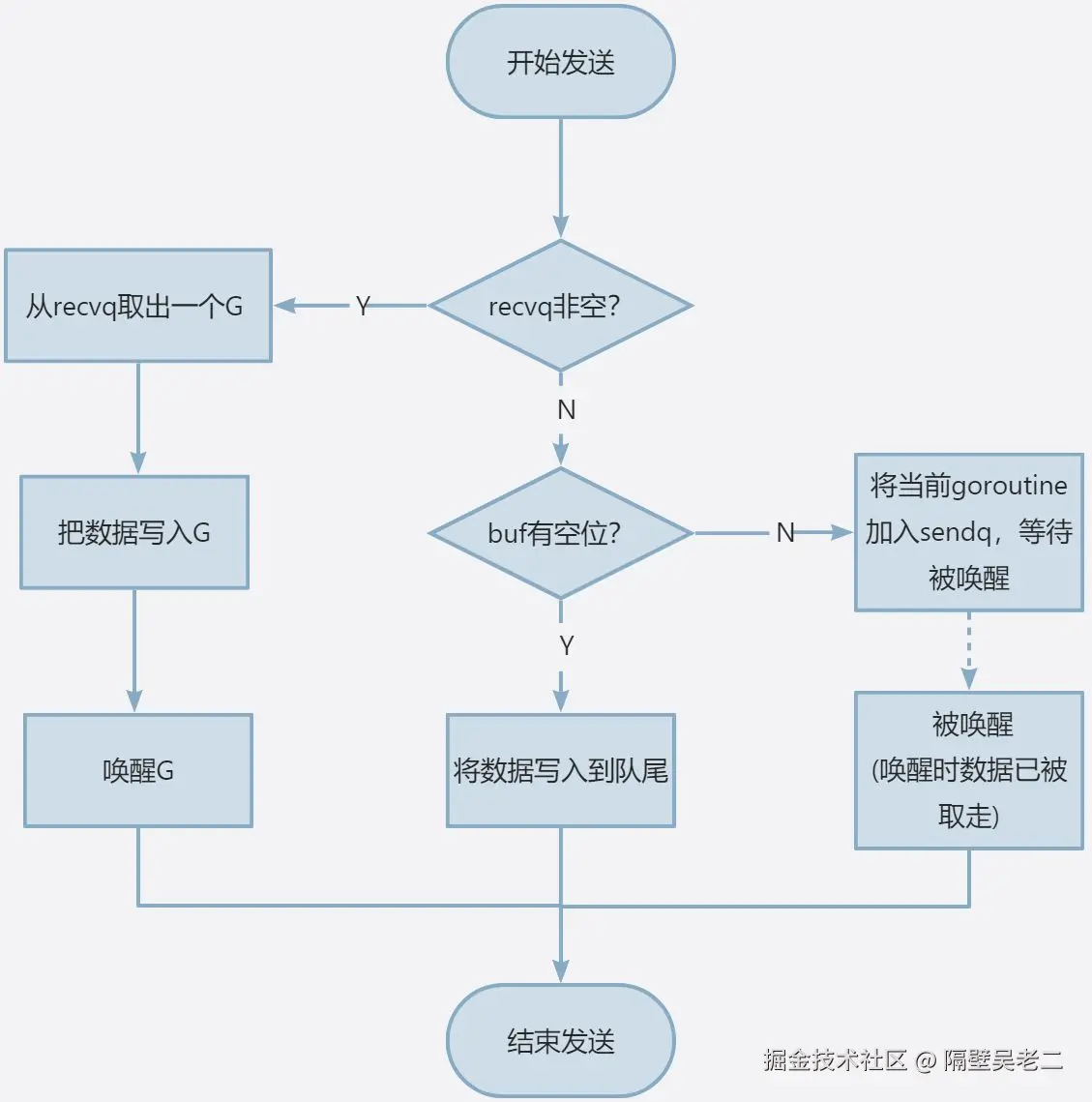 ch <- "Hello, World!" // 发送操作会阻塞,直到有人接收
