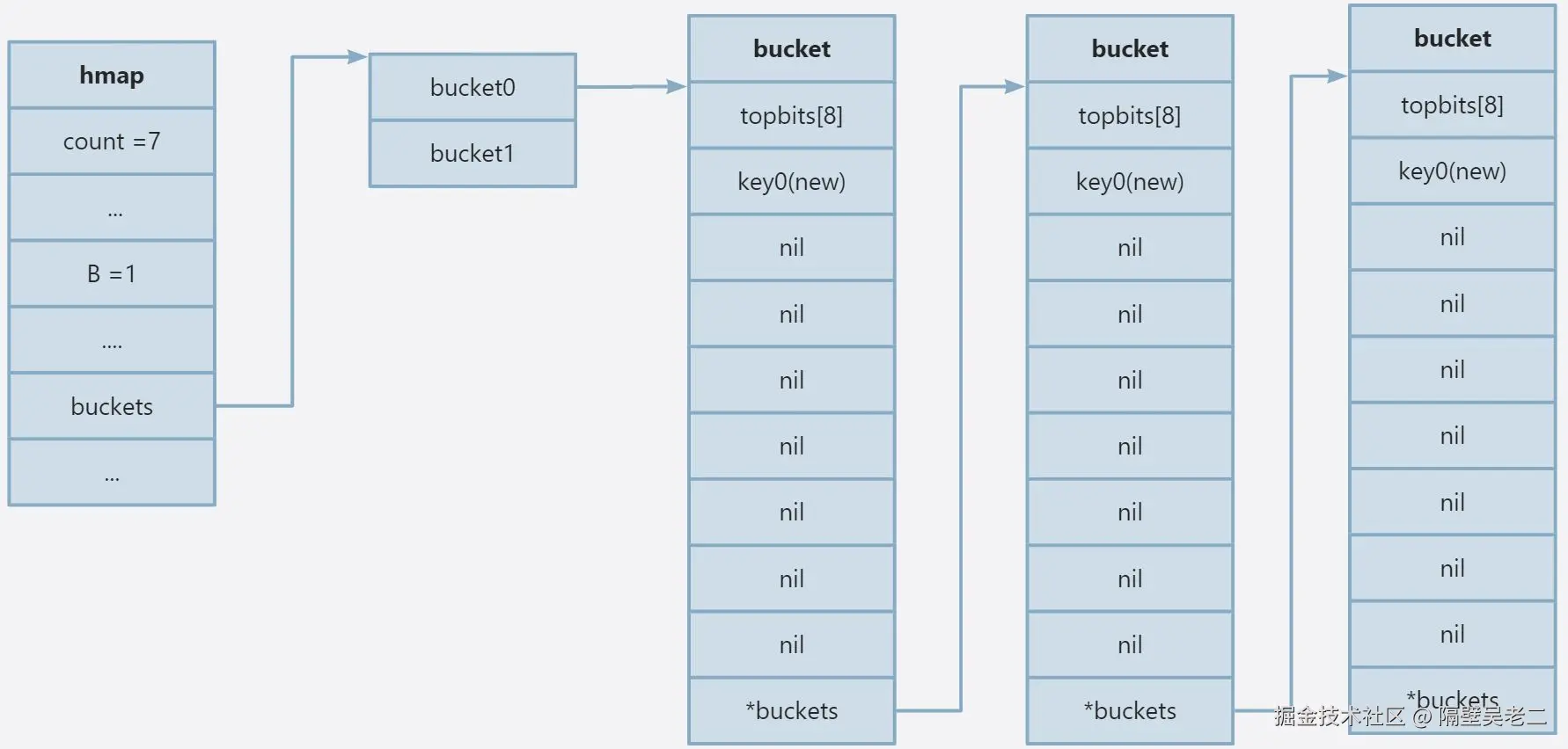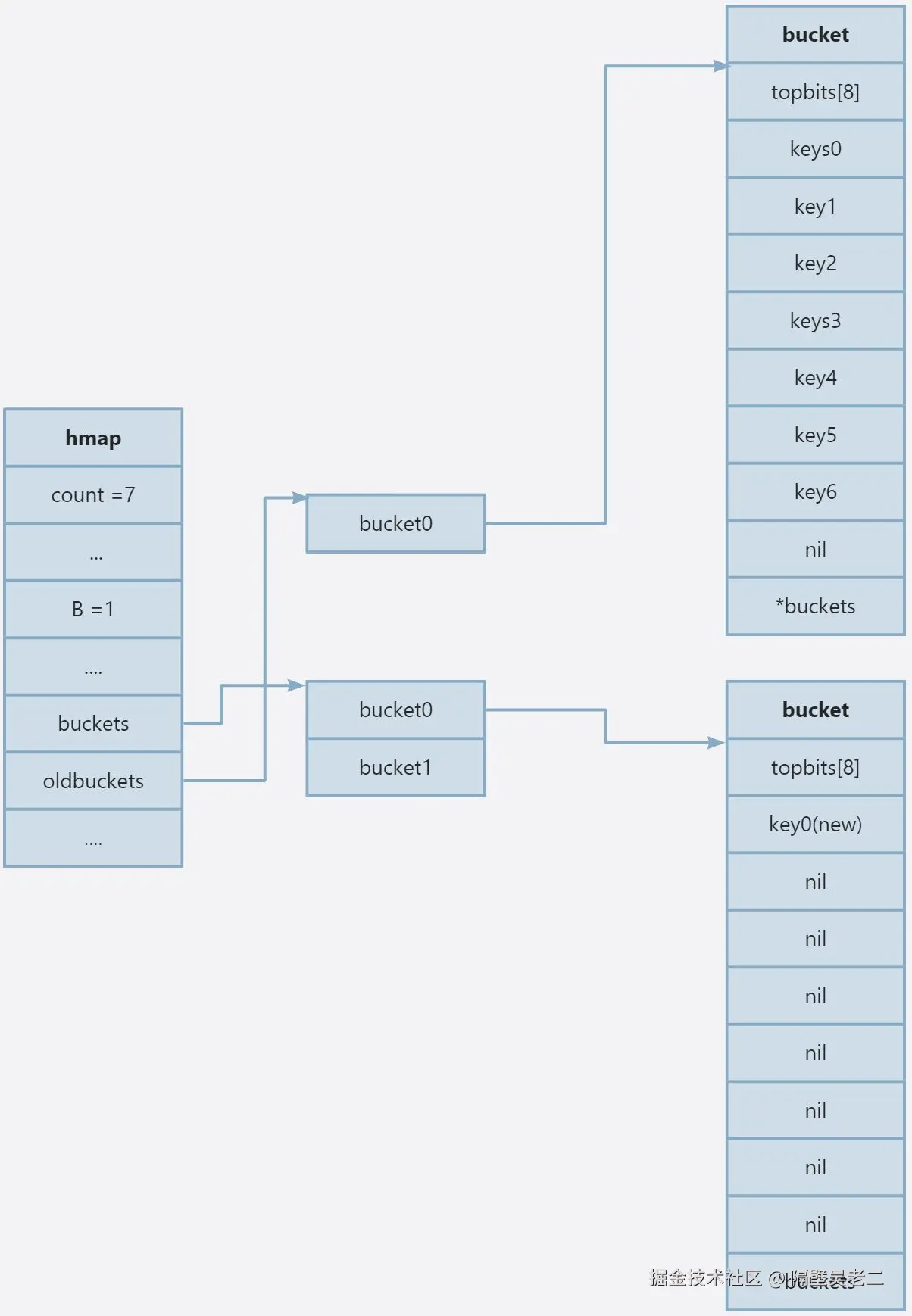 hmap数据结构中oldbuckets成员指身原bucket, 而buckets指向了新申请的bucket。 新的键值对被插入新的bucket中。 后续对map的访问操作会触发迁移, 将oldbuckets中的键值对逐步的搬迁过来。 当oldbuckets中的键值对全部搬迁完毕后, 删除oldbuckets。