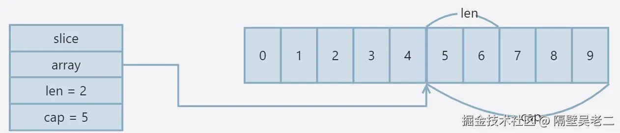 例如, 语句 slice := array[5:7] 所创建的Slice, 结构如下图所示: