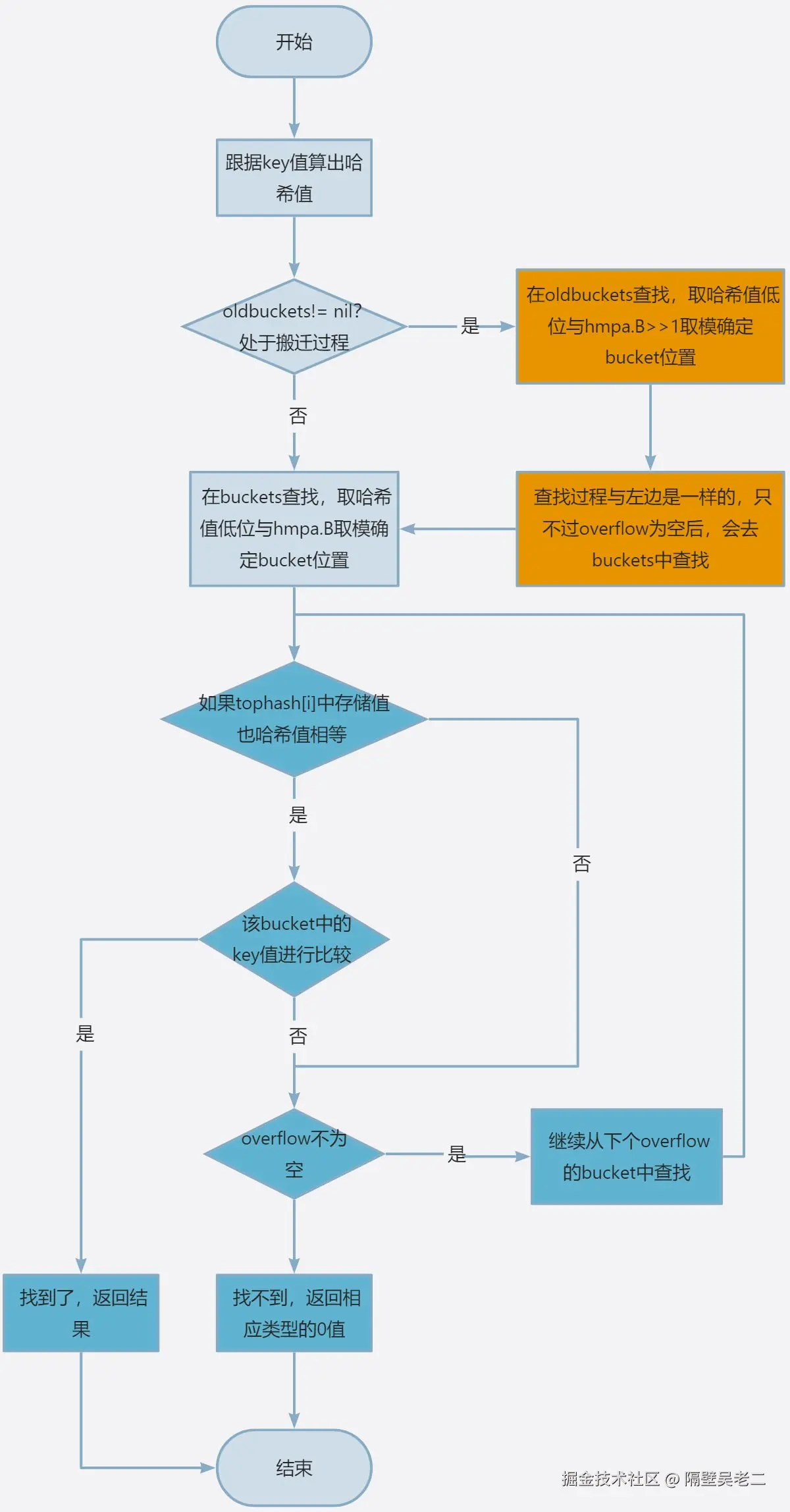 - 如果当前处于搬迁过程, 则优先从oldbuckets查找注: 如果查找不到, 也不会返回空值, 而是返回相应类型的0值