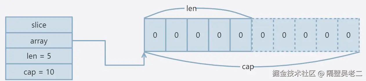 例如, 语句 slice := make([]int, 5, 10) 所创建的Slice, 结构如下图所示:
