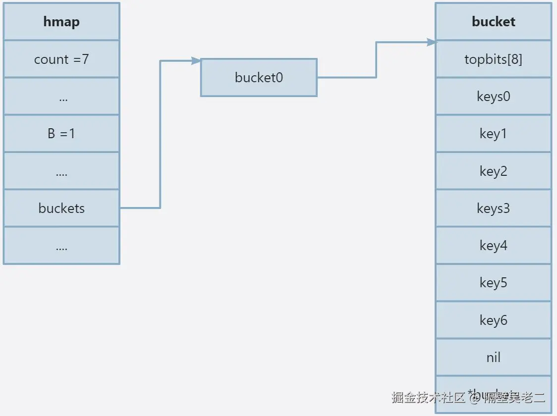 下图展示了包含一个bucket满载的map(为了描述方便, 图中bucket省略了value区域) :
