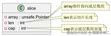 指针指向第一个slice元素对应的底层数组元素的地址,要注意的是slice的第一个元素并不一定就是数组的第一个元素。长度对应slice中元素的数目;长度不能超过容量,容量一般是从slice的开始位置到底层数据的结尾位置。内置的len和cap函数分别返回slice的长度和容量。