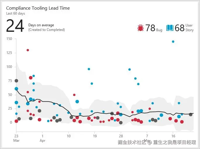 周期时间图展示了完成任务所需的平均时间。它帮助团队了解不同任务的完成周期。通过散点图的方式显示任务的周期时间,帮助团队识别工作流程中的低效环节。