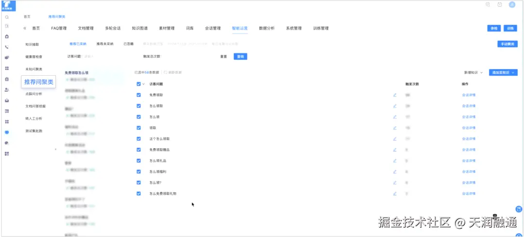 与未知问聚类相似,推荐问聚类是针对AI机器人不确定的问题,比如访客回复“领取”等这样比较模糊的问题,知识库里并没有很接近的知识点,但是算法找到了其他比较接近的知识点,推荐给用户,根据用户反馈,运营人员可以快速便捷完善知识库,提升AI机器人运营效率。
