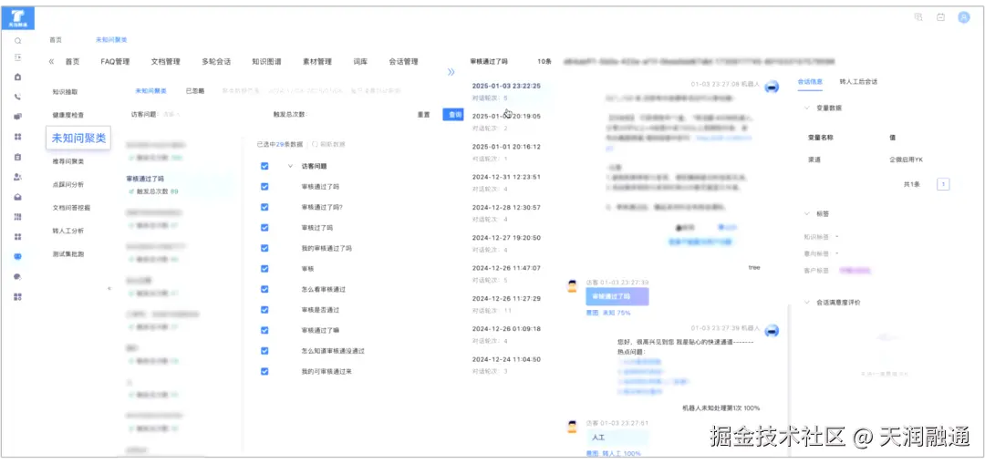 比如有多个访客均以不同的方式询问“审核通过了吗”,由于没有对应的知识,AI客服机器人无法回复,通过快速查看会话记录,可以发现客户是想问“某个产品晒单活动审核通过了吗”。通过未知问聚类,机器人训练师或运营人员就可以快速判断其是否为价值的知识,一键添加知识。