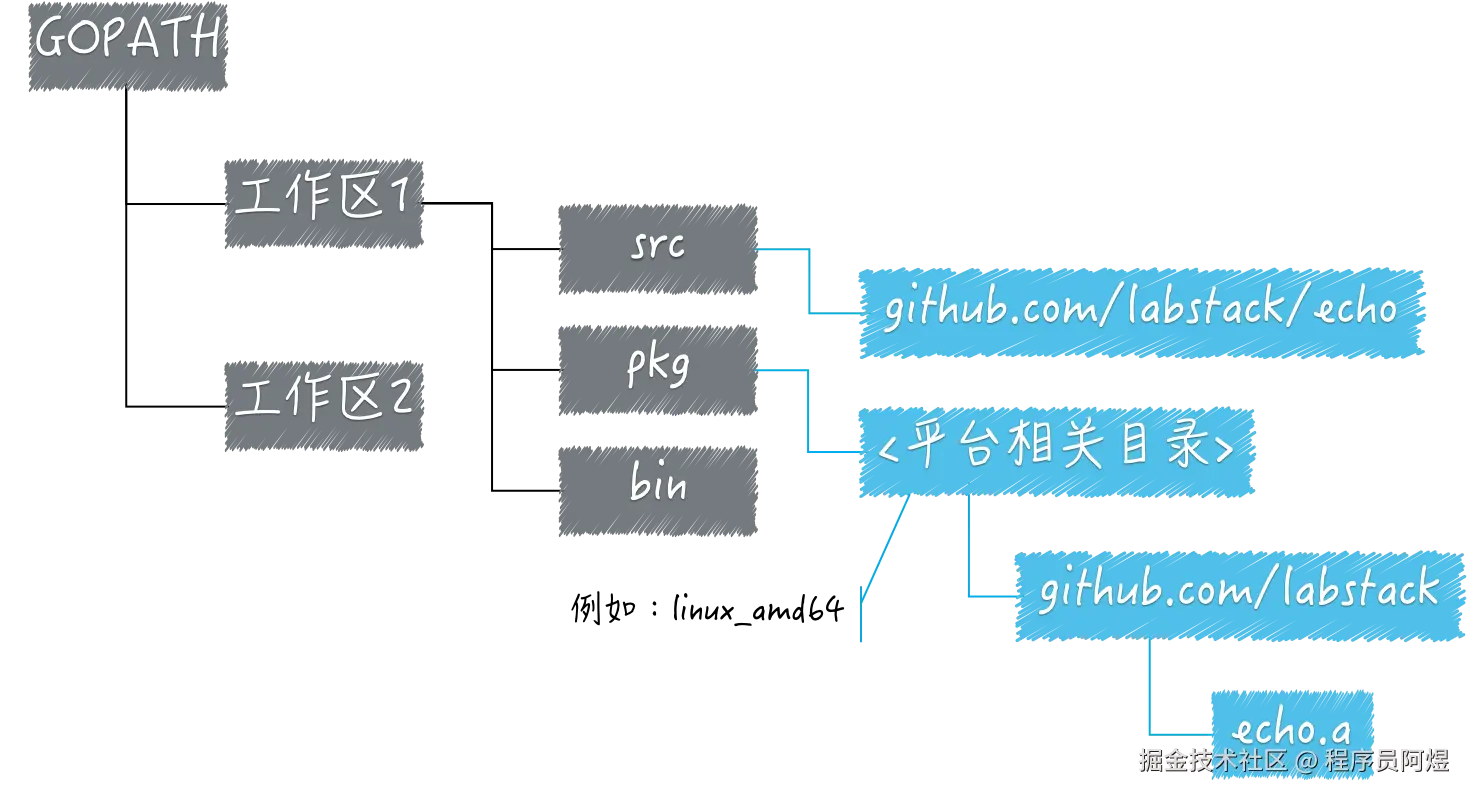 Go首先采用的GoPATH开发模式,GoPATH开发模式也是早期Go语言采用的默认方式。