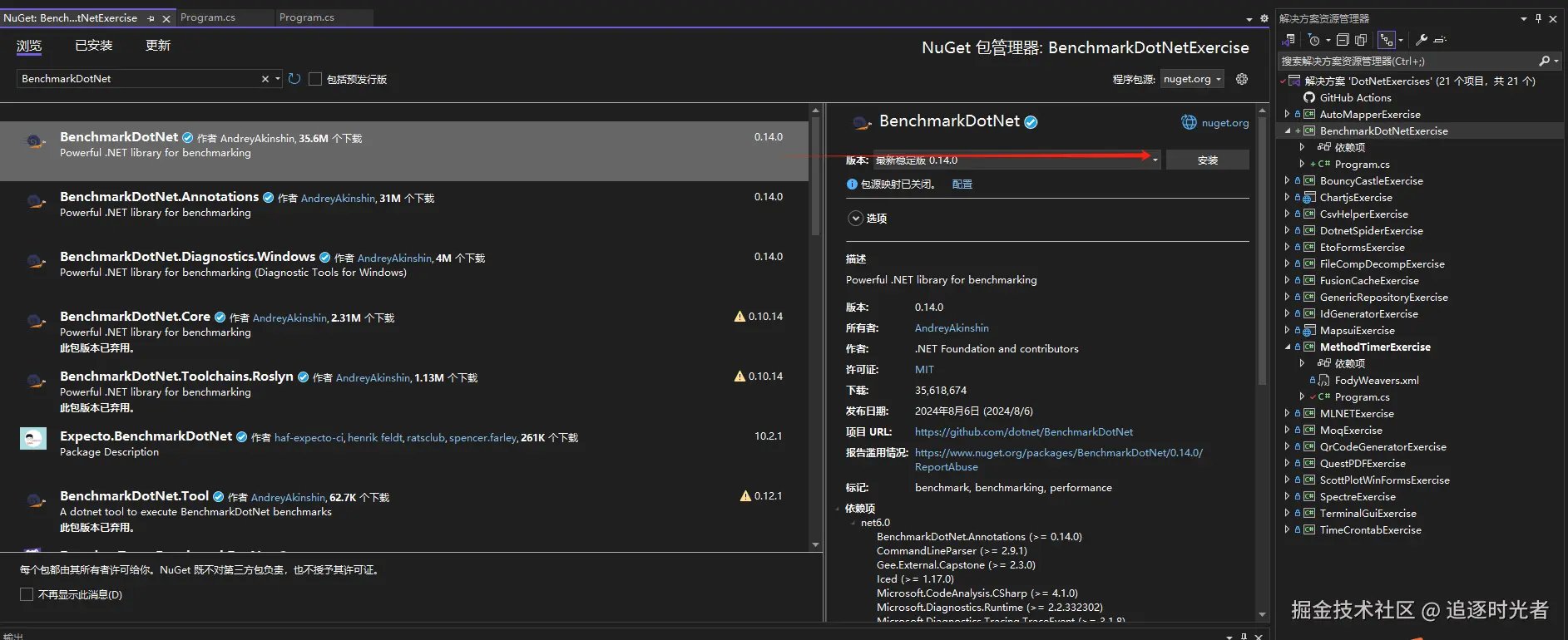 在NuGet包管理器中搜索:BenchmarkDotNet 包进行安装: