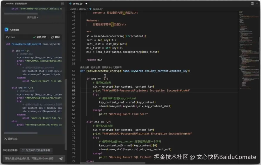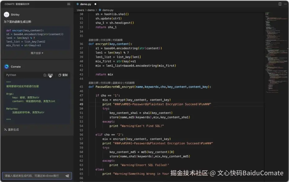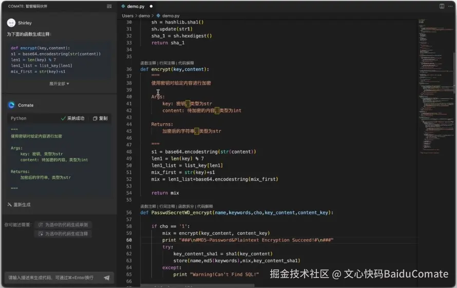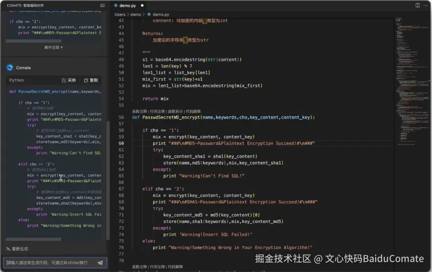 文心快码(Baidu Comate) 的“根据代码生成行间注释”功能,为开发者提供了便捷的解决方案。它能够智能地分析代码的结构和逻辑,并自动生成与代码内容紧密相关的行间注释。只需将你的代码提交给文心快码(Baidu Comate),它就能自动为你添加注释,帮助你更好地解释代码的目的、功能以及关键步骤,方便其他开发者快速理解和接手。这不仅提高了代码的可读性和可维护性,也促进了团队之间的沟通和协作,让开发者能够更加专注于编写高质量的代码,而无需担心注释的繁琐工作。