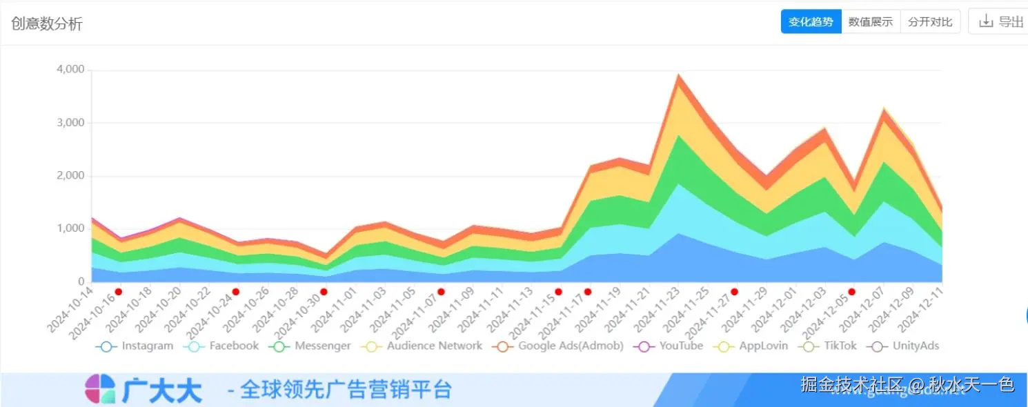 自【Dark War:Survival】在Android端上线以来,该游戏的投放量保持在1000以下,随着时间的推移,尤其是在10月份之后,素材投放量开始突破1000,到了11月15日,随着游戏版本的更新,广告投放量出现了激增,旨在利用更新后的优化和新玩法来吸引用户,这一策略成功为其带来超百万下载和千万流水。