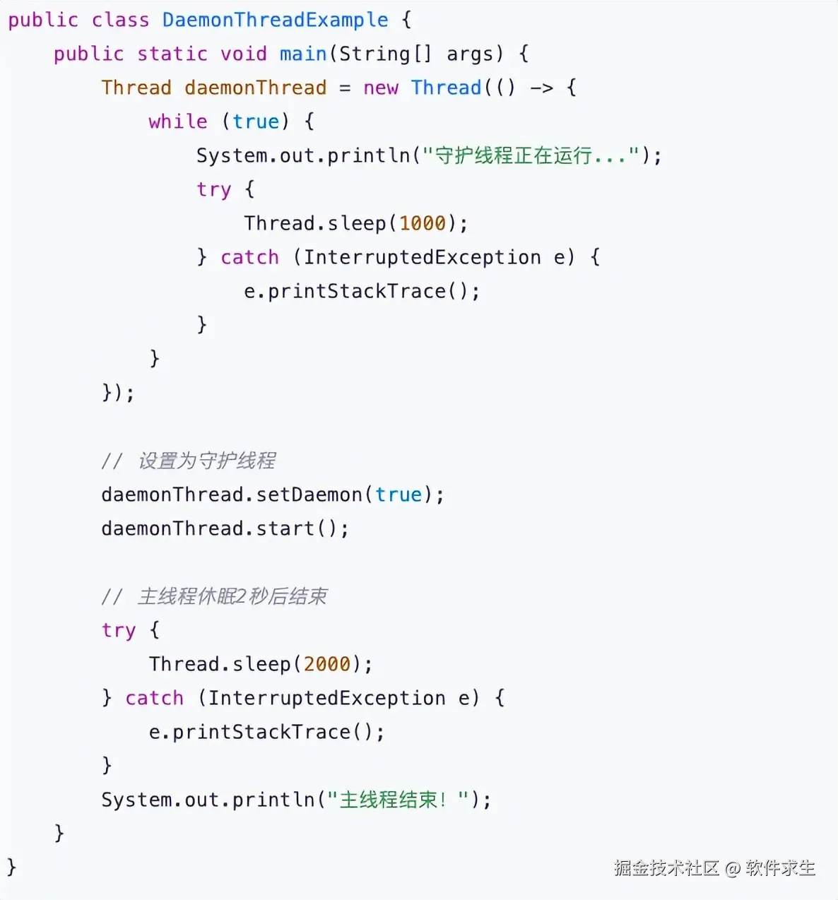 - 守护线程的设置时机setDaemon(true)必须在调用start()方法之前完成。如果线程已经启动,再设置为守护线程,会抛出IllegalThreadStateException。