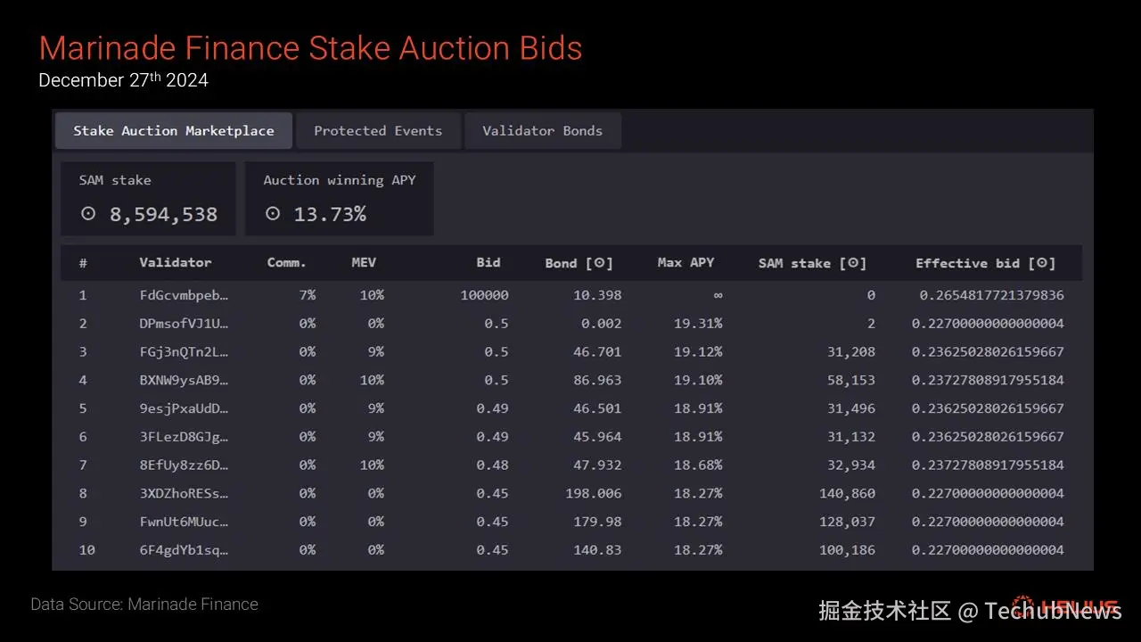 上图: Marinade Finance 质押拍卖市场 中的质押竞拍情况(2024 年 12 月 27 日)